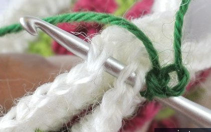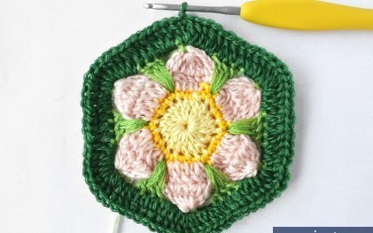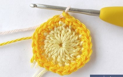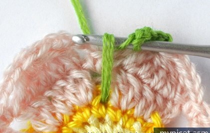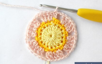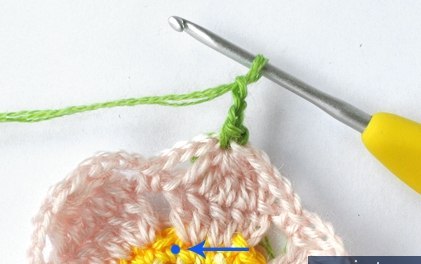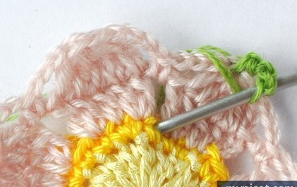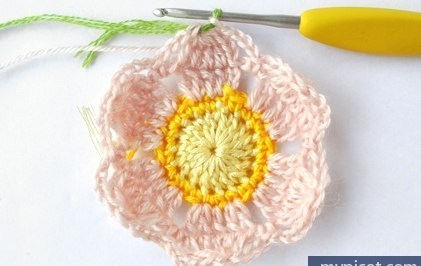 Diğer sırayı yine aynu renkle deliklerin üzerine dolamadan batmak suretiyle gözler dolguların üzerine ise 5 dolguyu örüp tığda çekmeden bekletin ve hepsi bitince 1 kerede çekn ki çiçek şekli alsın..