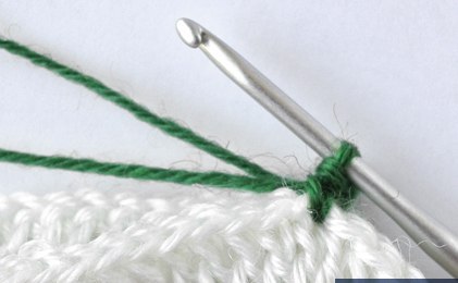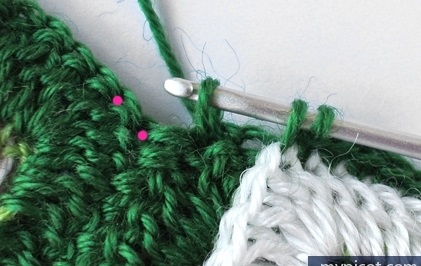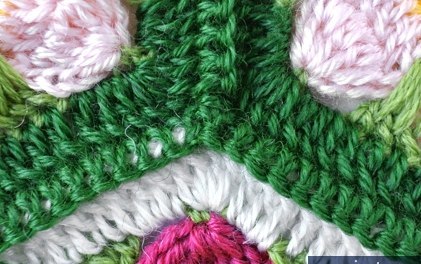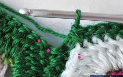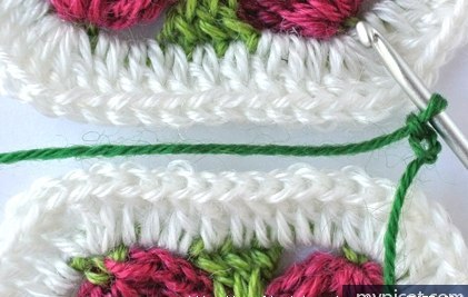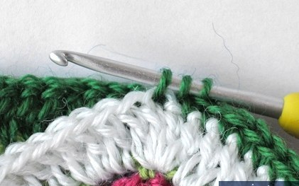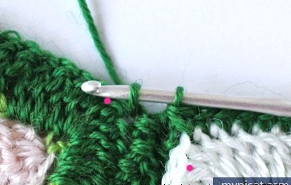 Diğer sırada diğer renk resimdeki gibi dolgunun tam ortasından başlayarak 3 zincir çekin ve resimde görüldüğü gibi 2. rengin olduğu bölüme batarak çekin ve orayı 3 kere doldurun.. Zincir çekin ve diğer dolgunun dibine batın, zincir çekin ve yine resimlerden yola çıkarak 2. ci rengin dibine yniden batıp 3 kere doldurun sırayı o şekilde bitirin..