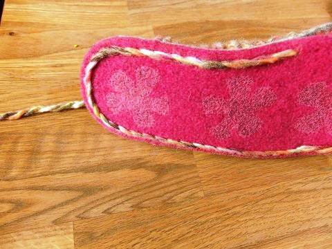 Bu kolayca örebileceğiniz ev ayakkabısı için ebrulu bir ip kullanabilirsiniz..
