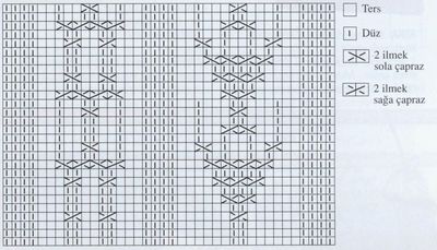 ÖN: Otuzaltı ilmek başlanır. Oniki sıça bir+bir lastik örülür. Diagramdaki örnek birebir uygulanır. otuzyedi santimetre’de kol evi için iki+bir ilmek kesilir. elli santimetre’de yaka kesintisi için üç+iki+bir+bir+bir+bir kesilir. Atmış santimetre’de omuzda kalan ilmekler bir defada kesilir. Ön kısımda diğer yarısıda aynı şekilde örülür.