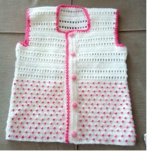 Tığ İşi Renkli Boncuk Süslemeli Kare Yakalı Bütün Olarak Örülen Kolay Çocuk Yeleği Tarifi. 2 .3 yaş